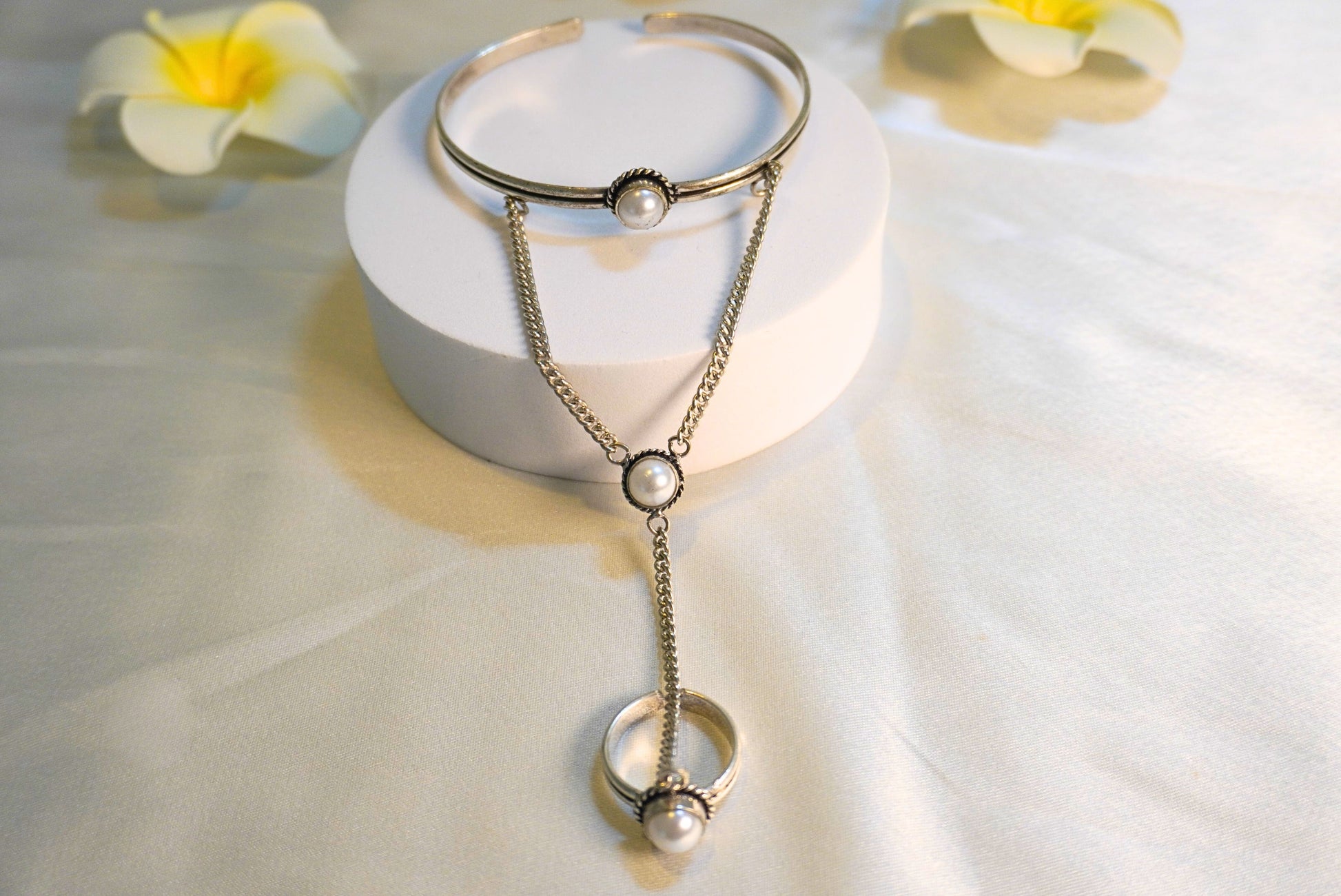 Ruhani Hathphool is an elegant fusion of tradition and contemporary design.The linked bracelet-to-ring design drapes gracefully over your hand, adding a touch of effortless sophistication.